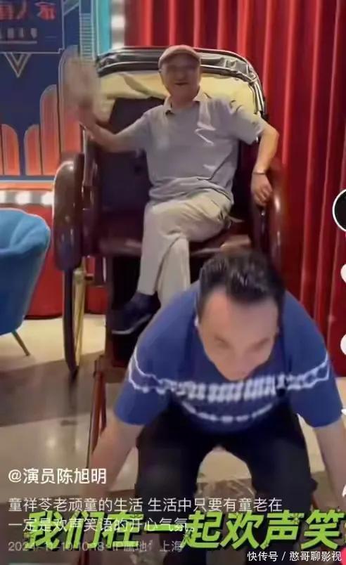 那时是演员陈旭明晒出来的,童祥苓坐在人力车上,手拄手杖(因为他的腿脚有些不便捷),面带慈详的笑脸,看上去终点精神,小数也看不缔造体不好的样子,妥妥的“老顽童”一枚。
