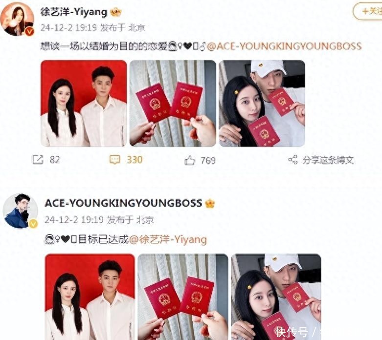 在案牍当中,徐艺洋称思谈一场以娶妻为主义的恋爱,黄子韬称接洽已竣事,并晒出了小两口领证的画面。